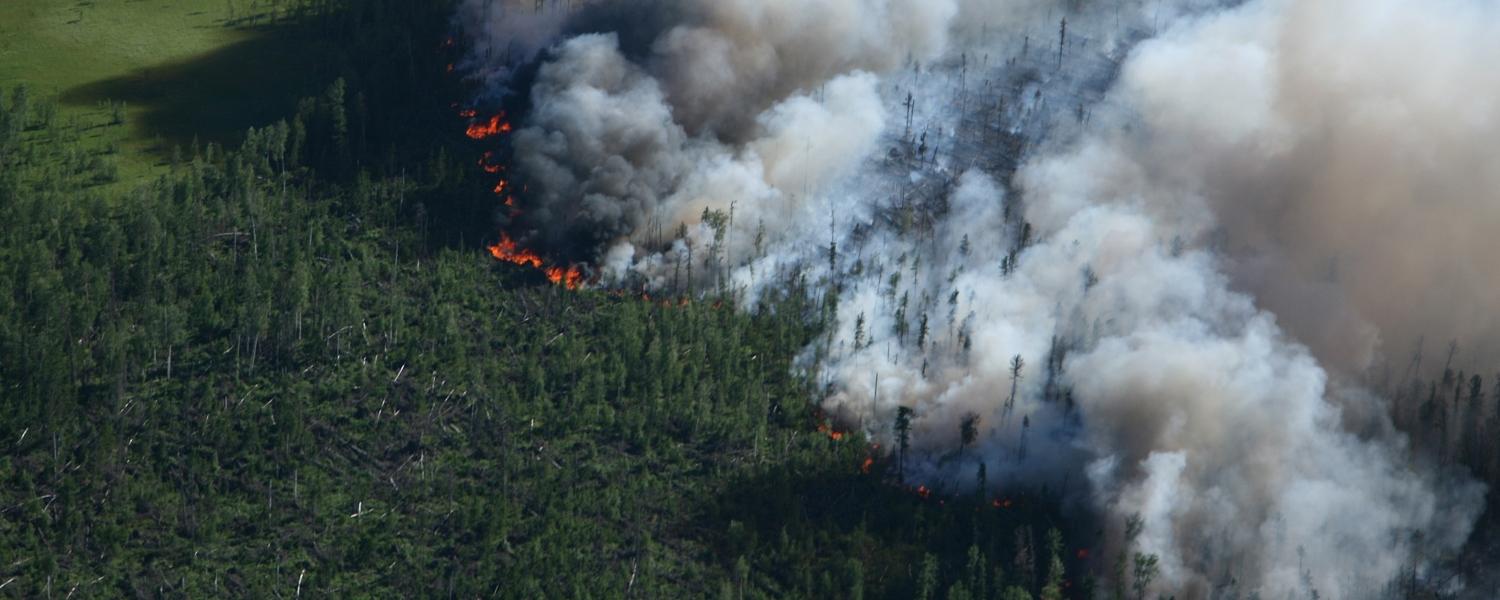 Wildfires burn unevenly across the landscape, creating green islands of unburned forest.