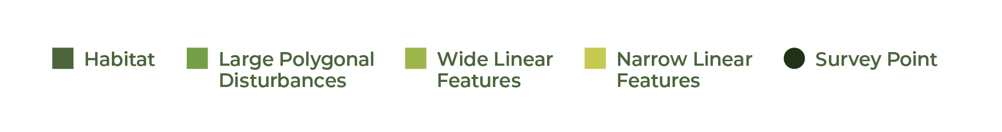 - Definition B: includes large polygonal disturbances from Definition A plus wide linear features (roads, pipelines >8 m wide, transmission lines).