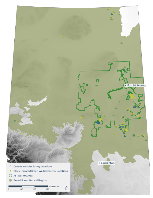- Canada Warblers were surveyed at 395 locations and Black-throated Green Warblers at 508 locations in mature deciduous and mixedwood forests 80-140 years old in Alberta’s boreal forest.