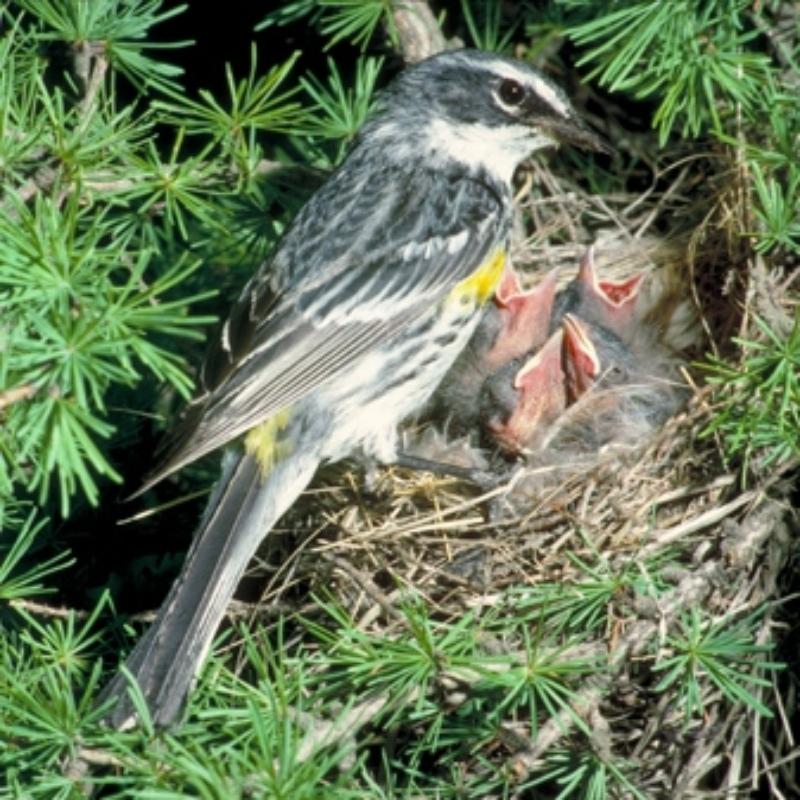 Forest songbirds, like the Yellow-rumped Warbler, have different habitat requirements for nesting and foraging.